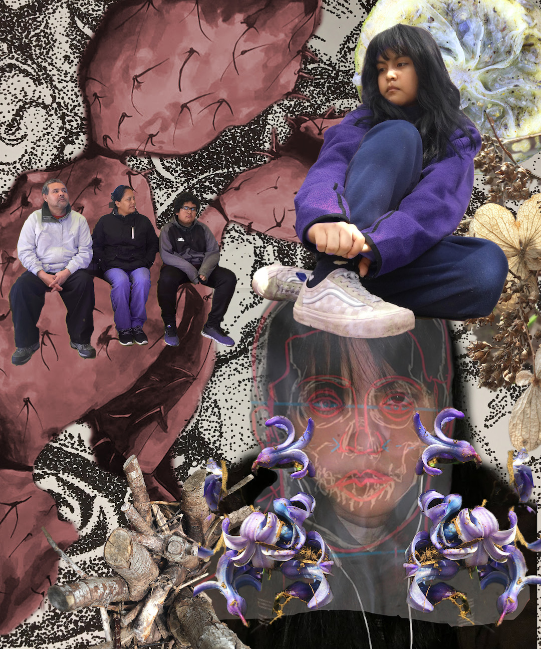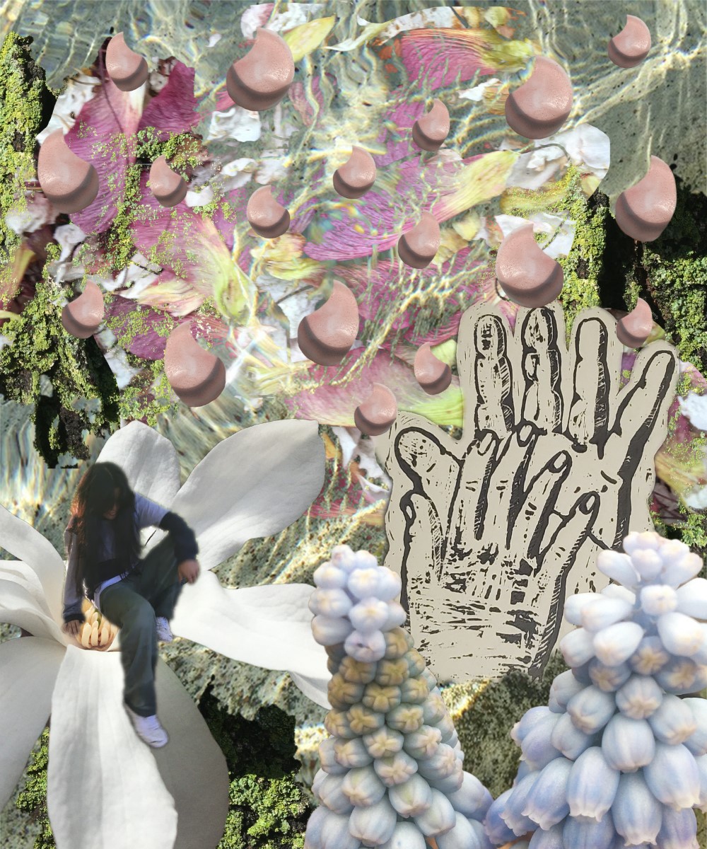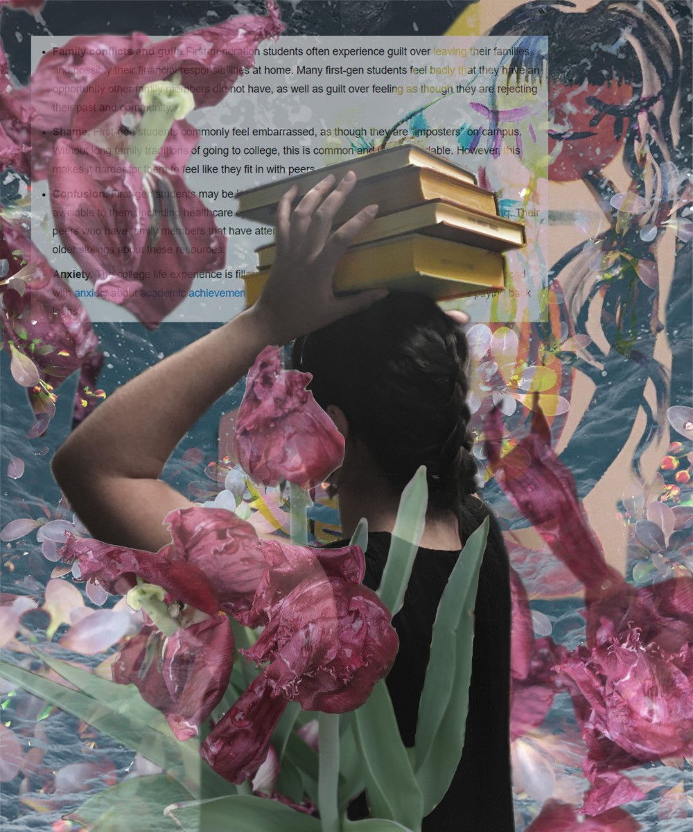 Navigating Independence (digital triptych): In these digital imaginary landscapes, I express how I feel navigating my independence through college, away from my family, and how I try to work towards healing on my own. As a first-generation student and eldest daughter of immigrants, the external forces of the world that impact my family also impact me and the way I go about succeeding in college and the pressure that is put on me to succeed to work towards a better life for not only my self but my whole family. Growing up, plants were a way I saw my mother connect with her roots and herself, I knew that when her plants were starting to dry out, something was wrong. I do the same here with these pieces, using dried-up flowers to help describe burnout, the high stakes my whole family has been dependent on me through a cactus, and using plants and greenery that are just about to start to blooming to my journey through learning how to take care of myself and the process of healing on my own.